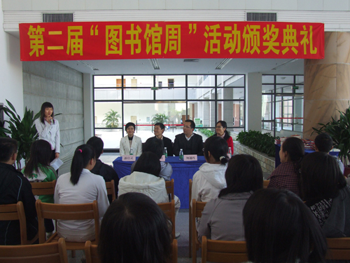 本网讯 11月29日下午,我校第二届“图书馆周”活动颁奖典礼在南校区图书馆一楼大厅举行。校团委副书记何越晖,南校区图书馆老师孙关周、王悦和潘启灵出席了颁奖典礼。