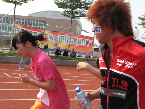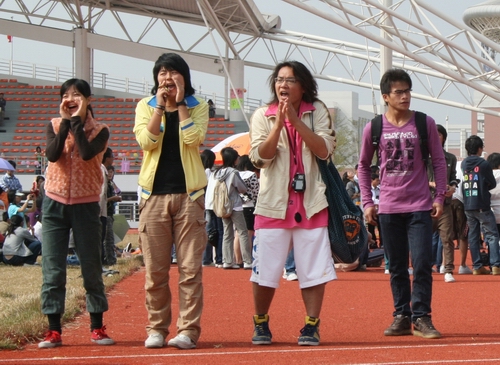 运动场边的阶梯看台是各个学院的大本营,各学院的拉拉队一直坚定地驻守在大本营,给场上的运动员加油打气。统一的服装,鲜艳的充气棒,响亮的口号、热情激昂的加油声……声声如春风般温暖了运动员们的心,如夏雷般激励着运动员的斗志,如烈火般燃烧了他们的激情。每一个代表队的成绩,有运动员们一半,也有拉拉队员的一半。“不怕苦,不怕累,只是希望你能拿个好名次!”一位同学如是概括拉拉队的精神。