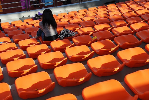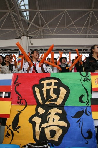 早上八点多女子100米栏预赛举行时,大本营人还不多,但西语啦啦队已经拉开阵势,为本院运动员呐喊加油了。不论在起跑点,终点处还是前进过程中,西语学院的拉拉队都一直舞动手中的充气棒为运动员加油。接近中午时分,天气逐渐炎热,其他拉拉队渐渐沉寂,他们还是保持着高昂的斗志。“我们六点多就坐车从北校过来了,但是并不感到累。我们人数不多,但是我们很团结。”