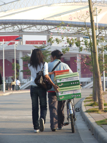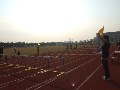 校运会还没有开始,田径场上的空气还没有升温,政管学院的两位女同学已推着自行车,带着运动员的鞋子,行走在通向比赛场地的路上;田径场上的辅助裁判和工作人员等等都已各就各位,开始投入紧张的工作。