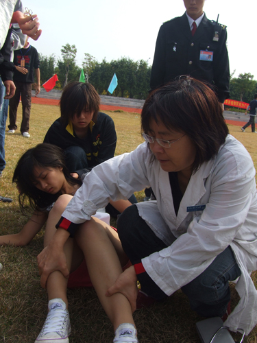 800米女子预赛时,信息学院叶同学于开跑后不久晕倒在跑道上。原本打算在终点迎接她的同学看见后都立刻向她跑去。一名男同学把叶同学抱起,准备送往跑道外时,校医也闻讯赶到。校医为叶同学做了简单的护理,同学们也及时为她盖上衣服,递上饮用水,在太阳穴上涂抹清凉油。叶同学很快就恢复过来。大家纷纷舒了一口气,说“没事就好,没事就好。”