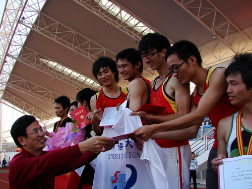 男子4X400米接力赛作为本届校运会压轴项目,自然少不了关注的目光。最后经贸学院以3分43秒90秒夺冠,管院跑出3分51秒68位居次席,商英学院以3分52秒12排在第三位。第一组的比赛中,商英绝地反击,在终点前数十米处反超西语而率先冲线。较之于第一组的惊险,第二组的比赛略显沉闷,经贸一路领先,抛离对手50多米冲过终点。经贸教练兼主力运动员钟诚志在接受采访时,兴奋地将他当时的心情描述为“天有多高,近在咫尺”,他个人也收获了本届校运会的第四枚金牌。