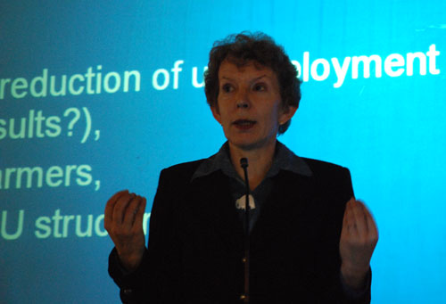 Elzbieta Kawecka 教授通过图表,展示了波兰的贸易平衡示意图等,形象地分析了波兰的近几年的经济发展状况。她还指出加入欧盟后,波兰的GDP得到了快速增长。欧盟资金的注入,也促进波兰经济的发展。