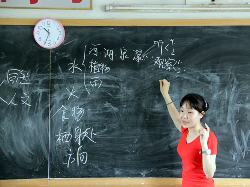 教学生辨别恼人的错别字,08西班牙语的胡路平有自己的一套方法。他在黑板上写含有常错字词的词组,让一个同学来填那个经常写错的字,再让另一个同学来做出判断并改正。课堂氛围十分活跃,大家都在座位上跃跃欲试。而当老师在台上点评的时候,大家也在欢笑中学习到了知识。接下来,数七游戏考验了一把大家的反应能力,也让课堂充满了欢声笑语。