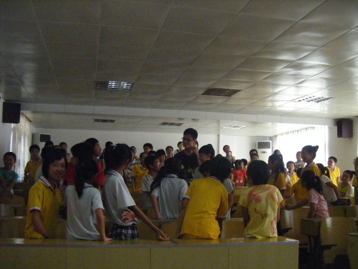 一系列活动后,我们便领学生来到电教室,在这里,我们举行了我们的“三下乡开学仪式”。开学仪式上,我们向孩子们展示了广外的美丽风景和浓厚的学习氛围,展示了我们队伍的强大凝聚力,展示了我们队员的多才多艺的一面,全场气氛更是达到高潮!