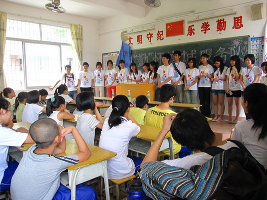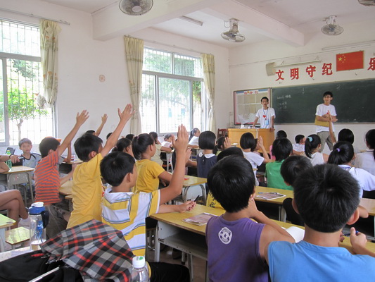 通过早上别具特色的见面会和家访,下午参加义教活动的学生人数达到了39,比原来增加了一倍。为了方便教学的顺利进行,学生们被相对应地分到小学班和初中班。小学班开展了三大活动:学习亚运会比赛项目的英语,猜单词与词组和唱队歌——《我的未来不是梦》。在教学过程中,小朋友们听得津津有味,并认真地做笔记和积极地回答问题。学生们十分活跃地参与到课堂活动中,使得课室充满了欢笑与快乐。在初中班则出现了另外的一种景象,6名初中学生跟义教组部分成员围坐在一起,进行了更进一步的交流。
