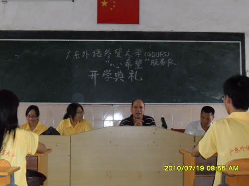 7月19号,“心希望”义教、调研等工作正式开始。早上8点半我们和校领导一同举行了一场简单的开学典礼,让学生们对我们广外、对我们服务队有个大致的了解。校领导和学生们都对此次下乡寄予了厚望。