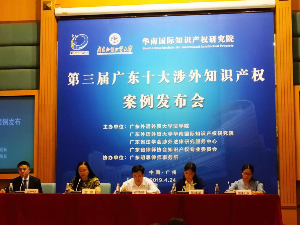 本网讯 4月24日,第三届广东十大涉外知识产权案例发布会在我校行政楼国际会议厅举行。东莞市爱芭娜服饰有限公司、深圳市钰锦服饰有限公司与陈颖姿(台湾地区)侵害实用新型专利权纠纷案等十大案例当选。本届广东涉外知识产权十大案例涉及著作权、专利权、商标权以及制止不正当竞争等多个领域,案件当事人涉及美国、英国、丹麦、荷兰、日本等多个国家和地区,对知识产权领域的一些新问题进行了积极有益的探索,体现了法官裁判和律师代理职业共同体的努力。