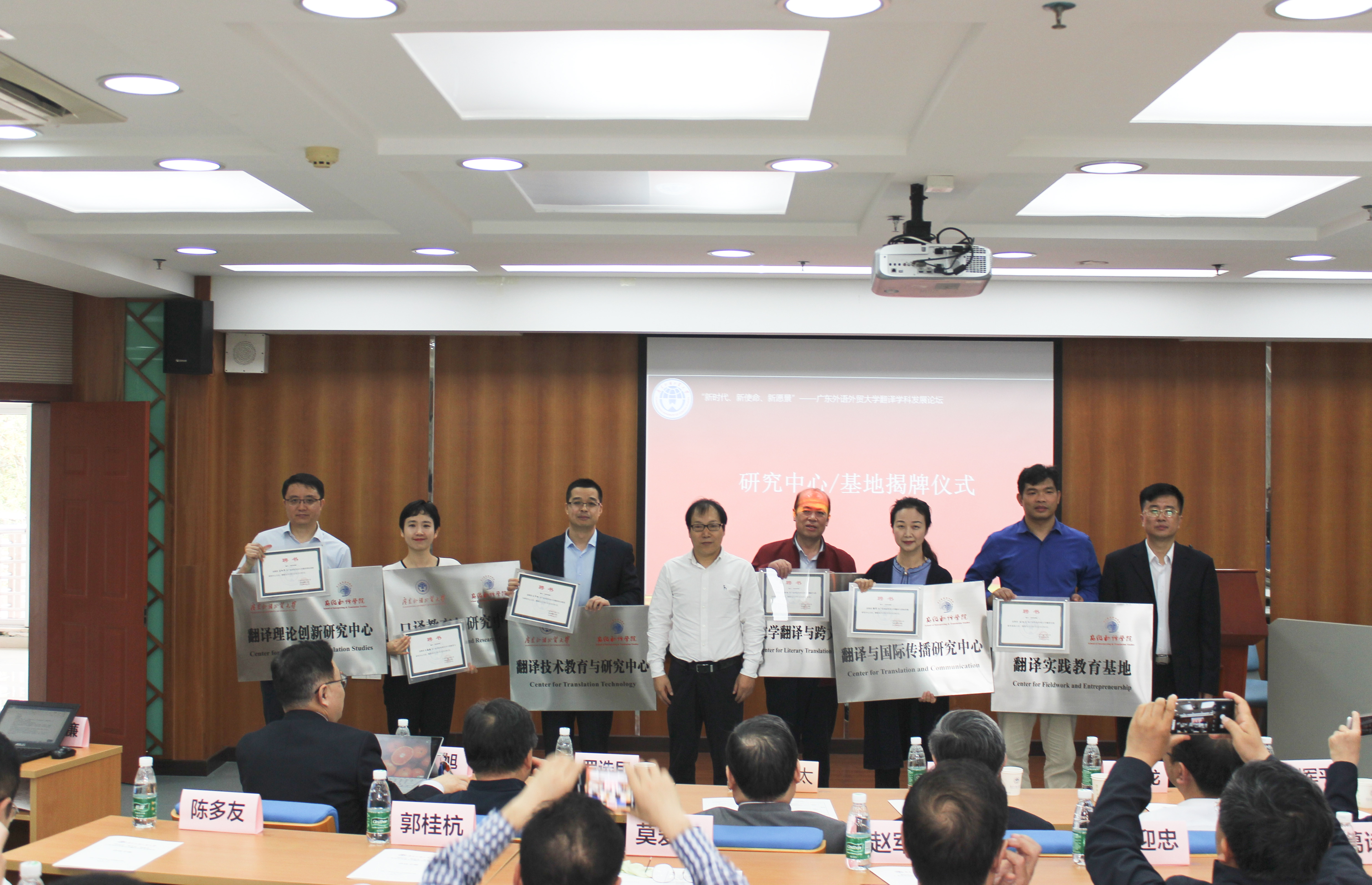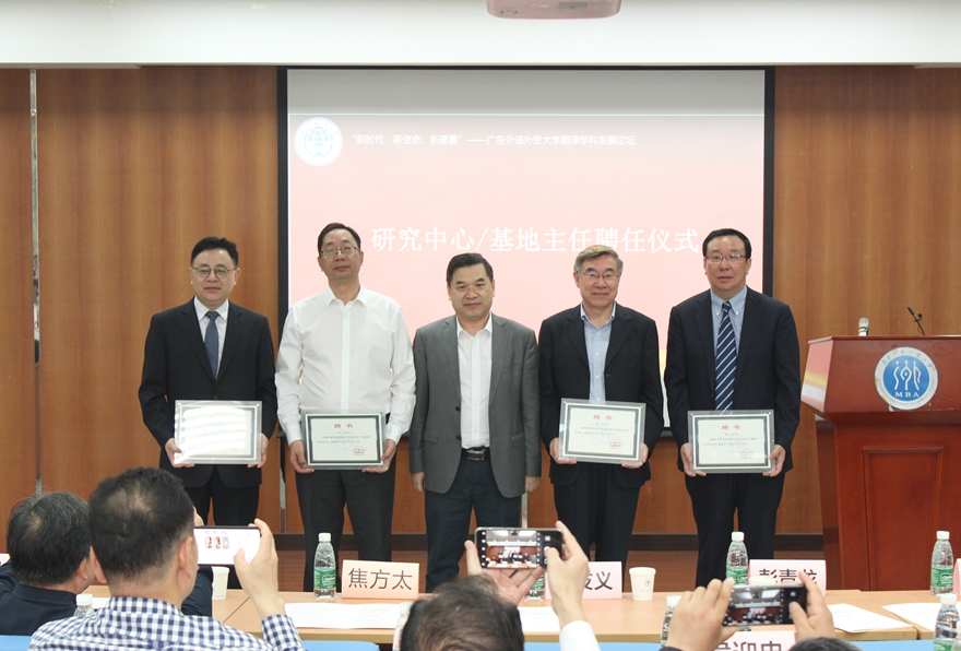 本网讯 4月14日,“新时代、新使命、新愿景”翻译学科发展论坛在我校第九教学楼举行。校内外百余名专家学者汇聚一堂,分析翻译学科面临的挑战和机遇,谋划翻译学科发展战略与创新进路。开幕式上还举行了翻译理论创新研究中心、文学翻译与跨文化研究中心、口译教育与研究中心、翻译与国际传播研究中心、翻译技术教育与研究中心、翻译实践教育基地授牌仪式,聘请全国翻译专业学位研究生教育指导委员会主任委员黄友义、国务院外语学科评议组成员彭青龙、武汉大学刘军平、广西民族大学张旭为学科咨询专家。
