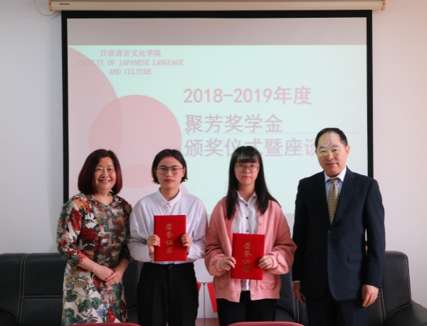 本网讯 3月27日下午,日语学院、亚非学院(筹)2018-2019年度聚芳奖学金颁奖仪式暨座谈会在日语学院会议室召开。日语专业1981级校友肖菊芳女士和其先生日本明治学院大学教授宋立水为获奖同学代表颁发获奖证书,并在座谈会上与同学们进行交流。据悉,聚芳奖学奖助金设立于2016年,由肖菊芳女士出资100万元,用于奖励学院日语专业品学兼优学生和资助经济困难学生,鼓励和帮助学弟学妹们健康成长。