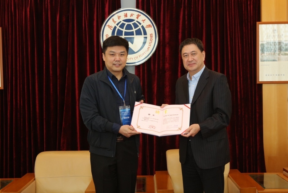 又讯 3月28日,北京大学印地语专业教授姜景奎、信息工程大学缅甸语专业教授钟智翔和北京外国语大学波兰语专业教授赵刚分别受聘我校客座教授,党委书记隋广军为三位专家颁发了客座教授聘书。