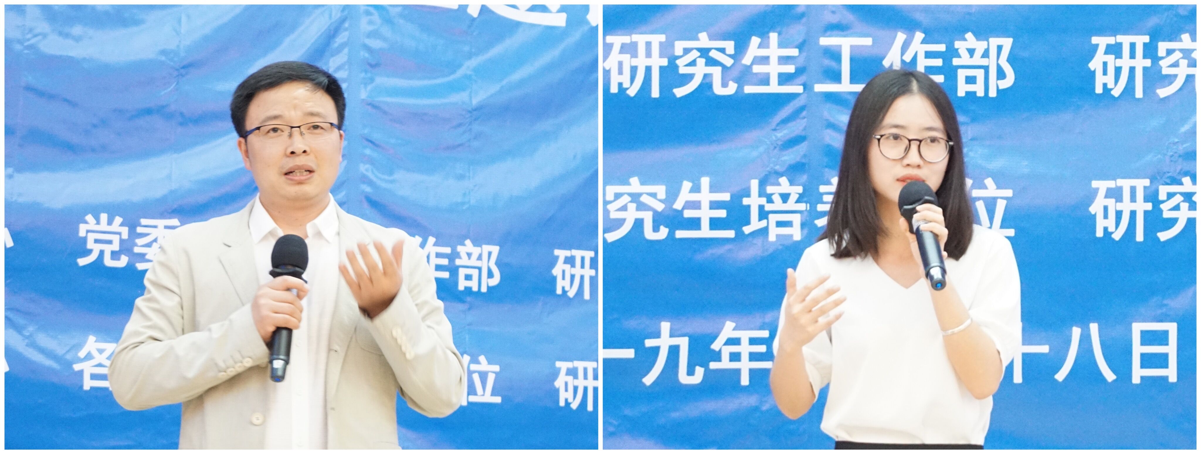 5位博士研究生,57位硕士研究生国家奖学金获奖者的成绩通过视频一一展示。研究生国家奖学金获得者代表翻译学院2016级博士生杜安、英文学院2016级硕士罗英璇分享了他们学术治学、工作实践的丰富经验。