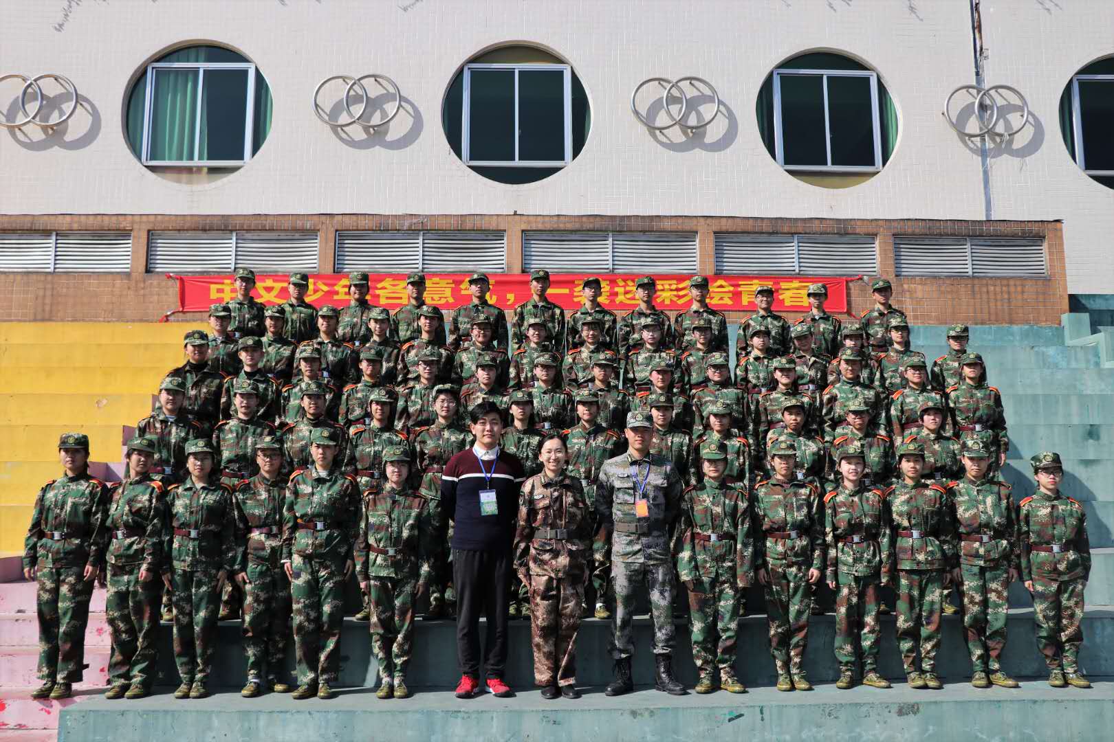 “军训不下一滴雨,燃烧你的卡路里”“中文少年各意气,一袭迷彩绘青春”,每一天,操场上这些红底黄字的标语都会吸引正在进行冬训的18级学生们的视线。或鼓励或逗趣,短短十余字,却代表了军训的“旁观者”们对“绿巨人”的关心与问候。