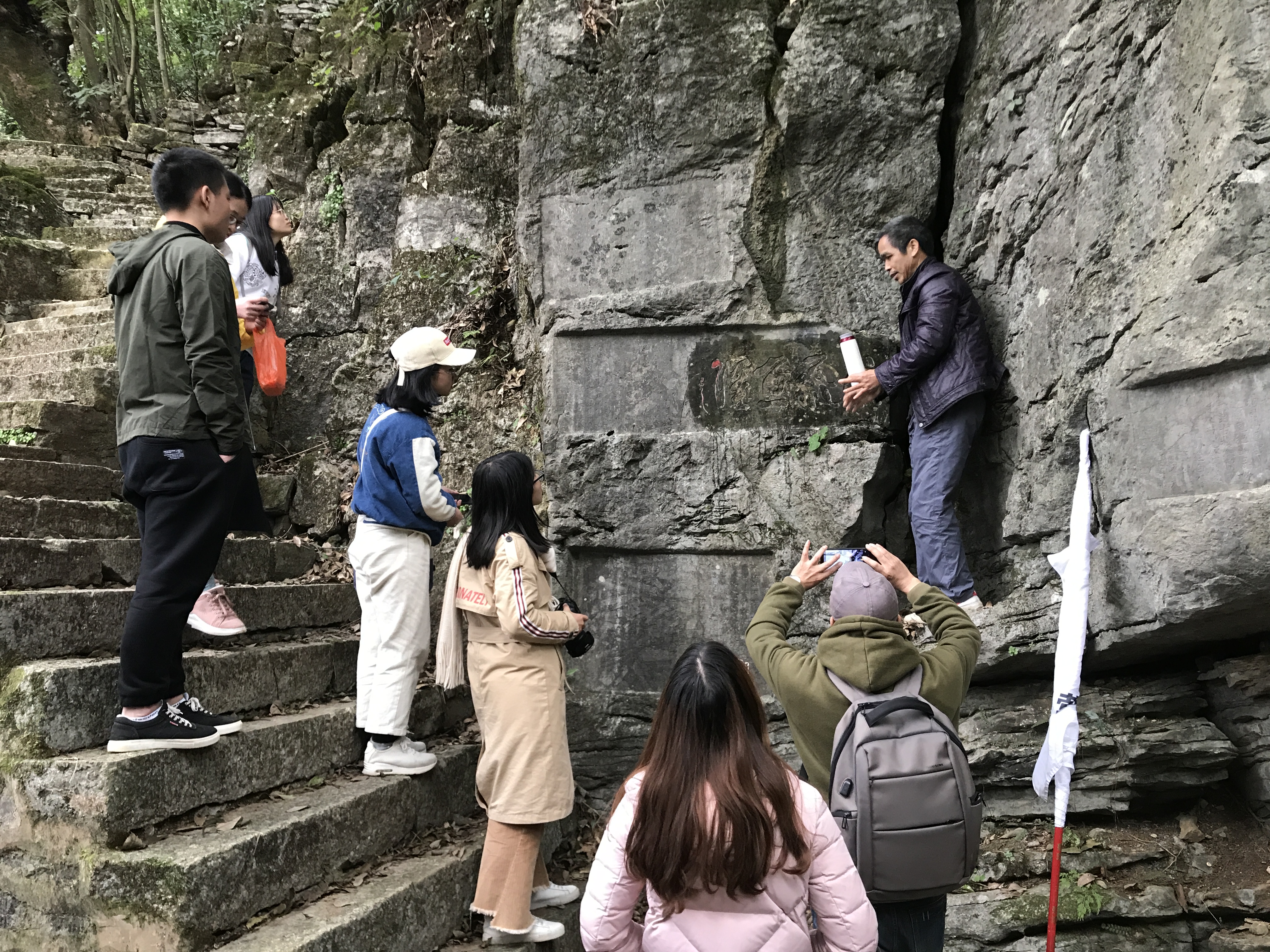 1月17日至18日,我校创意写作冬令营师生在当地中学老师黎老师的引路下,前往当地文峡山文明阁探寻解读颜真卿“鸢飞鱼跃”笔迹碑刻、刘宗标“小西湖”笔迹碑刻等珍贵碑刻,就日渐风化模糊的碑刻的文本备份与研究设立专题研究;与黄姚古镇退休老支书莫显家和昭平县黄姚中学前校长进行了深入座谈,对黄姚古镇的碑刻碑记、对联匾额、神灵信仰、人文历史、酒文化、古镇故事等有了一个较为清晰的印象。师生九人两两分组围绕初步确立的五大专题,走出课堂,走近黄姚,结合所学知识切实开展田野调查,以行动证明了实践出真知的硬道理。