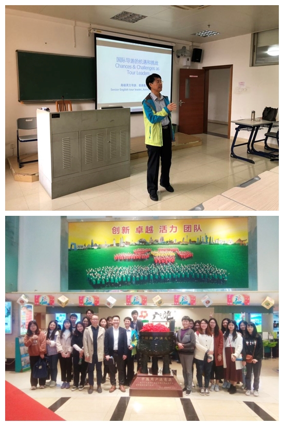 旅游系为学生安排了两场活动,《国际导游的素质和机遇》以及“前往广之旅学习交流”。校友蔡高明1975年毕业于广外,先后在广东国旅、广东省旅游局,省外贸旅行社等单位工作,为旅游英语系的学生展示了英文导游形象,介绍了出国游领队的必备素质,剖析了国际领队在旅游业发展中的机遇和前景。1月15日下午,蔡高明带领旅游系师生前往广之旅,与广之旅负责人事培训的总经理黄咏柔及其团队人员交流。
