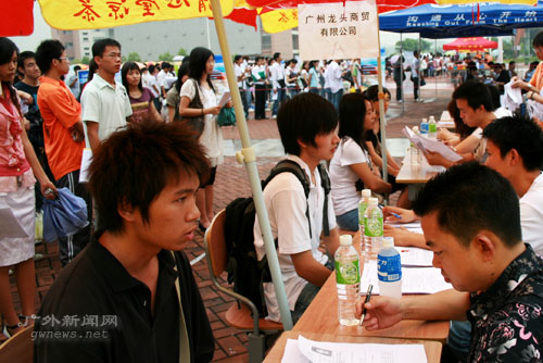 开场不到十分钟,中国移动通信广州分公司 、广州龙头贸易公司、IDP澳洲教育国际开发署、广州蓝月亮实业有限公司等招聘台前就已经排出了长长的队伍,这些公司成为学生们的热门选择。“之所以选择这些企业,主要是看中了他们的知名度,而且有些是今年新加入的企业,想挑战一下。”一位男生自信地说道。