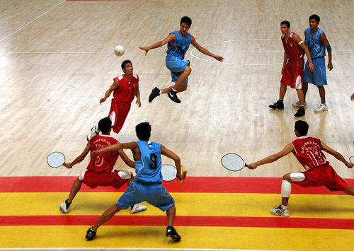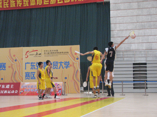 本网讯 11月16日上午,第八届全国少数民族运动会男子珍珠球四分之一决赛在我校赛区先赛两场。东道主广东队以40:23击败海南队,挺进四强。辽宁则以41:34小胜福建,同样跻身半决赛。海南省副省长符跃兰出席并观看了比赛。