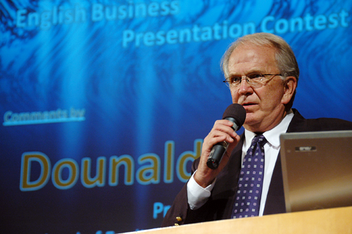 商英学院教授Mr.Dounald Thomas进行了点评。他表示,选手们严密的逻辑结构、细致精准的分析、匠心独运的构思、幽默机灵的回答给他留下深刻印象,也充分展示了广外学子的独特魅力。同时,参赛选手在比赛过程中努力探索和思考的精神也令他十分感动。