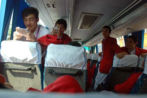 广东代表团的新疆少年们俏皮地用手机给睡着了的伙伴拍照。