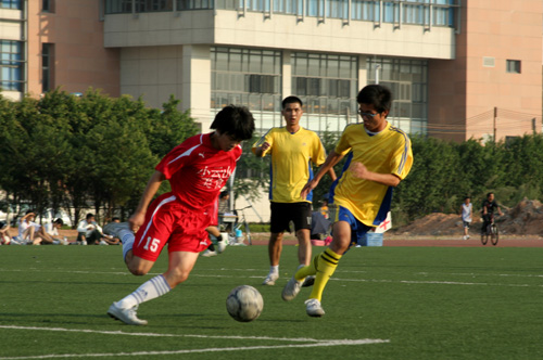 易地再战,双方都做了一定的人员调整,法学院在换人后进攻仍不见起色。反倒是经贸新换上场的7号在禁区内与队员配合后的射门打在防守队员身上后折射入网,帮助经贸取得三球的领先优势。