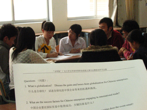 C组选手在买卖双方的斡旋中则显得格外老练。他们谈到购买数量、支付方式、检验费用的承担以及长期贸易伙伴关系的建立等问题,并就产品的花色、含棉量进行了很细致的讨论。