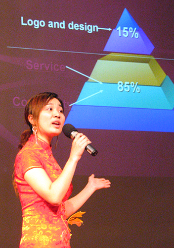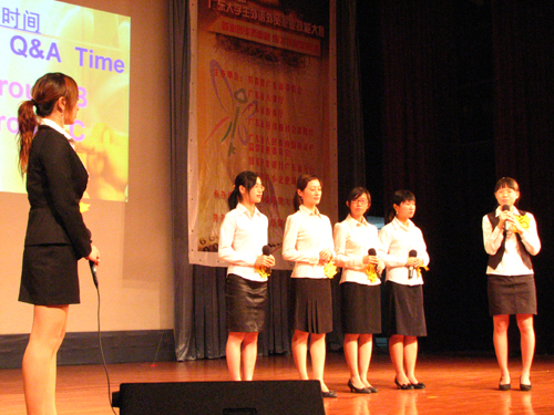 产品讲介环节中,一位身材匀称、有着甜美笑容的女生着旗袍上场,她熟练的英语、落落大方的台风、优雅的身姿吸引了在场观众的眼球。在本组选手放错PPT时她表现出的镇定自若和稳重更是赢得了在场观众的称赞。她就是来自我校经贸学院的选手刘蓉。刘蓉最终以总分第二的成绩获得大赛一等奖,并获最佳讲介单项奖。