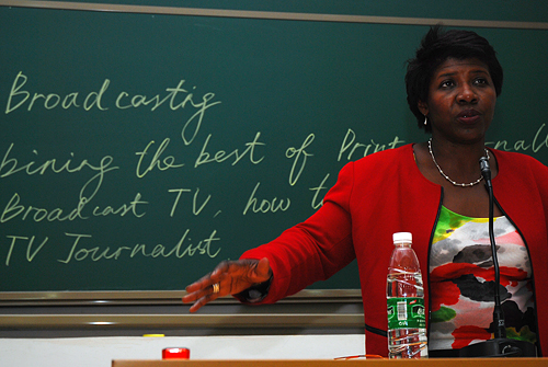 本网讯 10月16日下午,美国著名电视节目主持人Ms.Gwen Ifill在南校C507与广外学子进行交流。此次讲座由国际交流处和新闻学院主办,新闻学院副院长高坚主持。Ms.Gwen Ifill围绕“Combining the best of Print Journalism and Broadcasting Tv,how to be a good Print & Tv Journalist”,阐述了她的新闻理念。