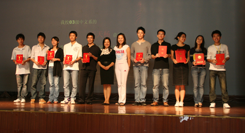 在邹海同学演唱完《勇气》之后,谢秀兰副书记宣布创新奖以及获省级以上节目及演员的名单并与涂颖老师一起为获奖同学颁发了证书。谢副书记同时表示这不仅仅是对艺术团工作的一种极大的肯定,同时也是对新一届的艺术团团员的一种鼓舞,希望他们能够在艺术团体中发挥自己的长处,把艺术团体打造成“校园文化的核心力量”。