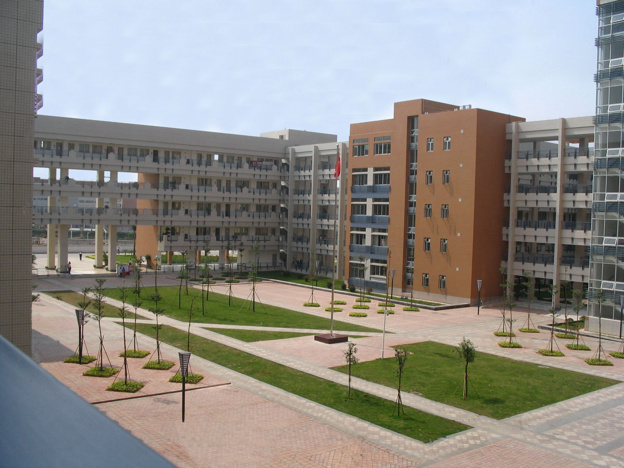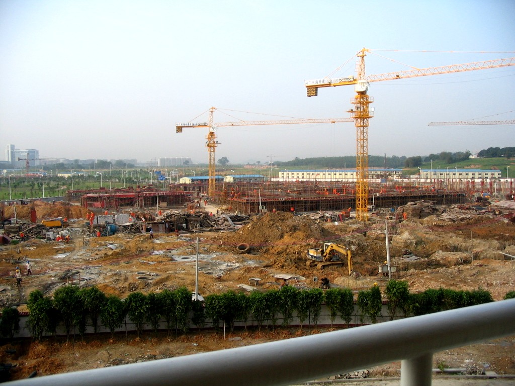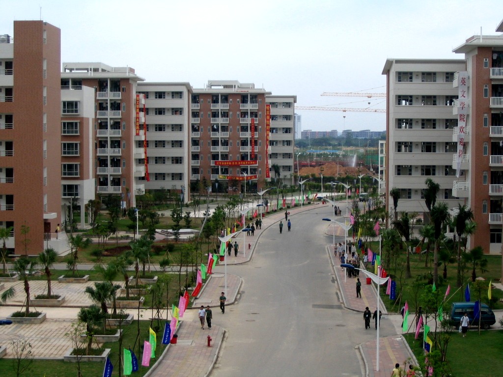 2006年,大学城二期工程基本完工——图书馆和艺术楼已建成并投入使用,博雅园、风采园都“开饭”了,7、8、9、10、11、13栋都已陆续有学生入住……整个广外大南校区的基础设施基本完成,但仍不是完整——去年田径场南边的球场还未建成,而06级新生军训旅三营九连七排的同学们就在球场的建筑工地上军训。