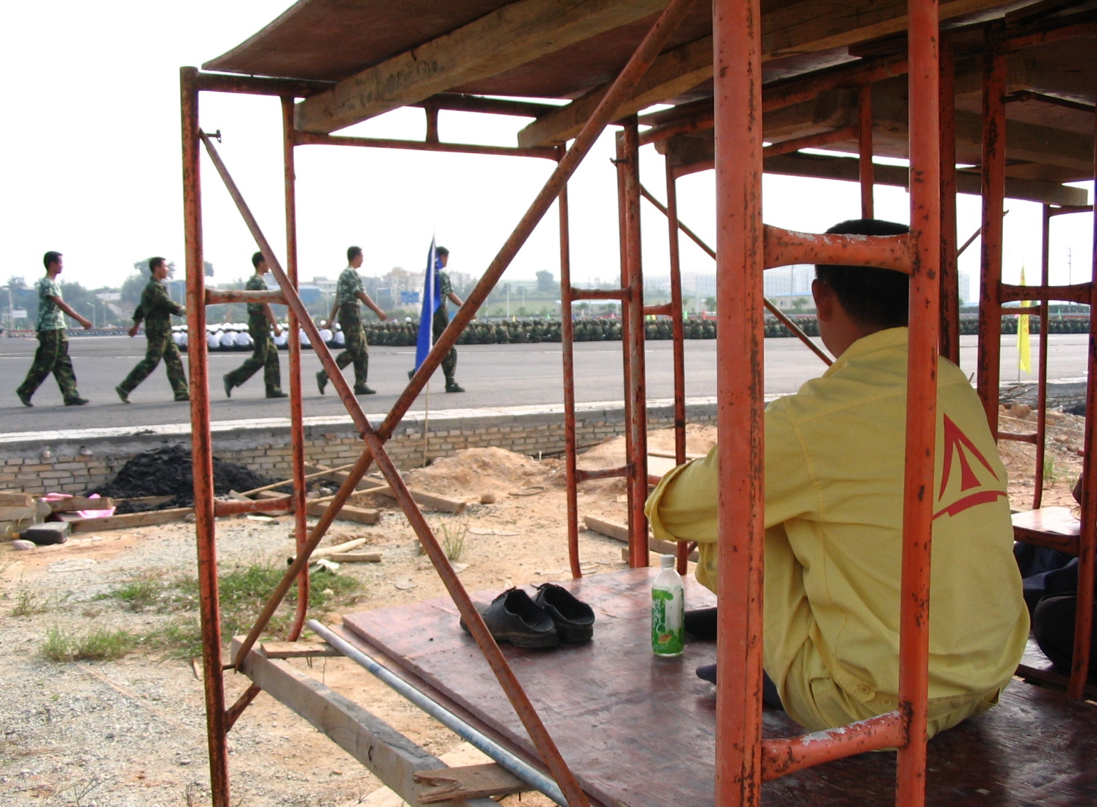 一旁的施工大叔在木板架子下休闲“检阅”烈日暴晒中的军训旅