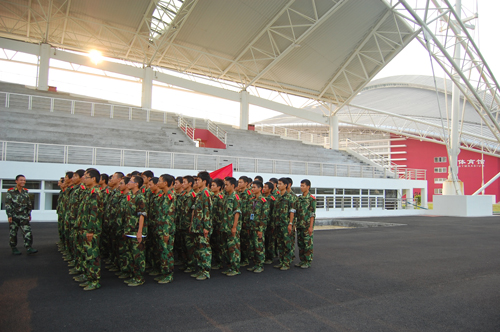 今年军训的场所相比去年又有了很大的变化。其中尤其引人注目的就要数新建的体育馆了。场馆占地1万多平方米,顶棚像两片交叉的树叶。主体墙面采用先进玻璃材料制成,采光特别好,而且玻璃和馆顶还可以打开进行通风,大大节省了能源消耗。可容纳4000多人的体育馆给新生们提供了非常好的训练空间。