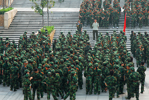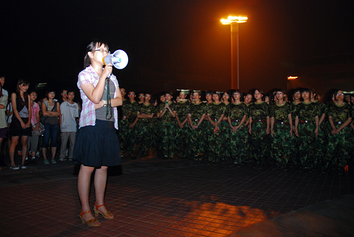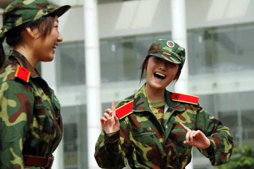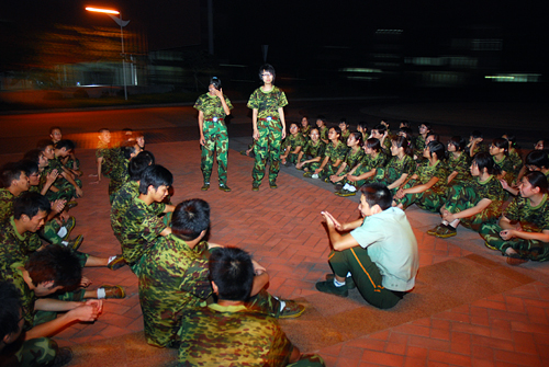 不是穿着流行服饰的帅哥靓女在音乐厅高歌,而是广外训练场上衣着橄榄绿的男方块向女方块拉歌。与女生的细腻不同,男生的拉歌更显粗犷。教官一声令下,男方块全体放声高歌“对面的女孩看过来……”,有的同学还配以夸张的姿体语言,惹得对面的女孩阵阵欢笑。一个女生笑道:“男生唱得不怎样,但那些搞笑动作让我们印象深刻,这也算是相互认识的一种方式吧!”