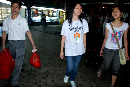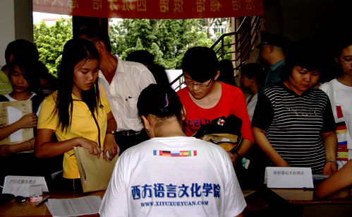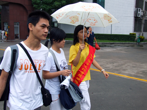一名志愿者,为多名新生服务着