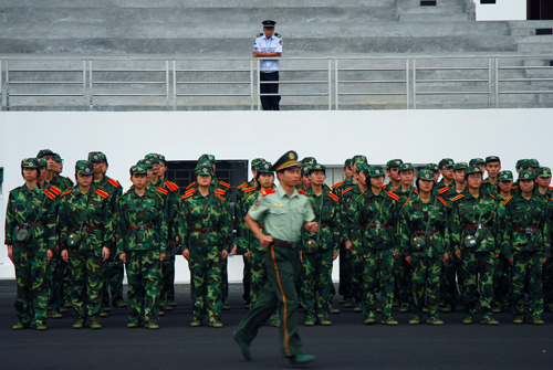 七点四十分,校道上已经分据着多个方块。整齐响亮的“教官好!”一声比一声高。