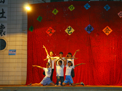 下午2点,所有的队员都从午睡中醒来,揉着惺忪的睡眼,开始紧锣密鼓的筹备工作。二楼,文宣组队员正制作帷布,那一笔一划都勾勒出他们的专心;一楼,义教组队员带领自己的班级队伍跃跃欲试,俨然将要作战的士兵;台前,男女司仪背诵台词,作最后的调整;台下,演员积极排练……到处都洋溢着一丝紧张,一丝激动,一丝喜悦,冲淡了离别的意味。