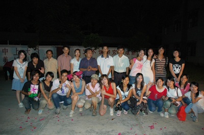 集体舞蹈《all together》中,我们带队人商杰强老师现场踢足球的表演掀起现场一阵高潮,农村孩子跳起现代舞,动感十足,一点不比城市孩子逊色。手语歌曲《爱,因为在心中》是我们新闻学院NEWSCAR的重头戏节目,我们把这个感人的节目带到这个晚会,许多学生都非常喜欢这个节目。参与表演的学生只用几天就把整首歌的手语动作学会,当晚的几十双手同时演绎这个动人的歌曲感染了在场所有父老乡亲。一首大合唱《明天会更好》又一次感动了在场的所有人。当晚恰逢是我们下乡队长MILK姐的生日,在场所有学生于是用韩语唱出了生日歌送给她,一些学生早早采摘了一大束花当场赠送给她,让她感动不已,又笑又哭。下乡所有成员最后一台走秀把整台晚会推向高潮,大家虽然穿上普通的衣服,走起秀来却像模像样,舞台感十足。