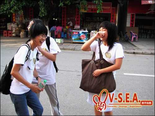 三下乡,是一种感动,是一种收获。14天,或许只是我们人生几十分之一的一段路程,但这段路却记载着我丝丝的感动:永远记得在散步的路上我们不顾仪态抢雪糕、出丑态,为小事而引来的欢声笑语;永远记得我们V-S.E.A.18人筹备Farewell Party一起奋战到天亮的满腔热情;永远记得大家为了“整蛊”我这个“变态”队长苦思冥想的痛苦表情;永远记得……正是有了V-S.E.A.,我愿意利用绝无仅有的丁点复习时间来留下一个想离开的队员;我愿意承受三个难以承受的职务来换回我的队伍;我愿意靠坚持每天吃药来和队员扛过这艰苦的日子;我愿意与各位把自己4年来没有流过的泪水一次灌注在这份下乡收获与感动上;我愿意……哪怕误会,哪怕厌恶,哪怕失败,我都要和我的队员走过这14天。