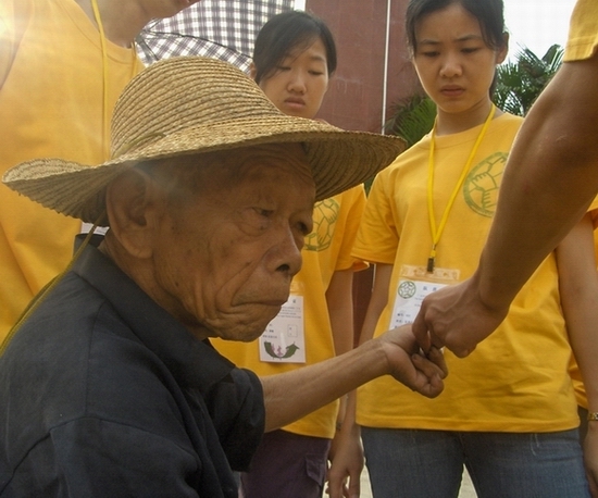 7月25号这天,全体早起准备街坊服务日。就在准备出发的时候,一位特殊的客人造访。他是我们驻地河唇敬老院的一位老人,慕名前来求医。慕谁的名呢?——我们队伍里四位广中医的师兄师姐,他们现已是大六的学生,在医院实习也有半年了,他们的加入为广外鹤水团员三下乡队伍注入了新鲜元素。