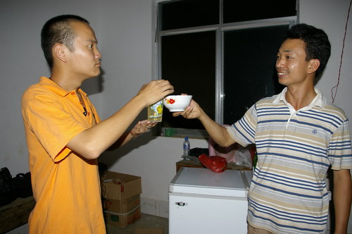 “有什么需要尽管说出来,学校会尽可能协助你们的。”从初到快要离开,校长把这话重复了再重复。自从一位队员在宿舍丢了手机,校长就经常地在宿舍外来回走动,他说要当我们的“保安”。六月初六,是壮族的一个传统节日,校长让夫人给我们做了一大袋的点心。我们吃在嘴里,甜在心里。