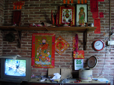 她的脸被烟尘蒙上了一层灰蒙蒙的面纱,一双眼睛也被熏得红红的,带着疑惑的神色打量着我们这几个不速之客。脸上隐约可现的褐斑、额头纵横交错的皱纹、扎成辩盘起来的灰白的头发无不诉说着岁月的沧桑。高大的身材,看起来壮实有力。身穿一廉价布料的对襟衣,衣服上的补丁格外醒目,黑色的裤子沾满灰尘。当我们说明来意后,叶大娘邀请我们进屋。
