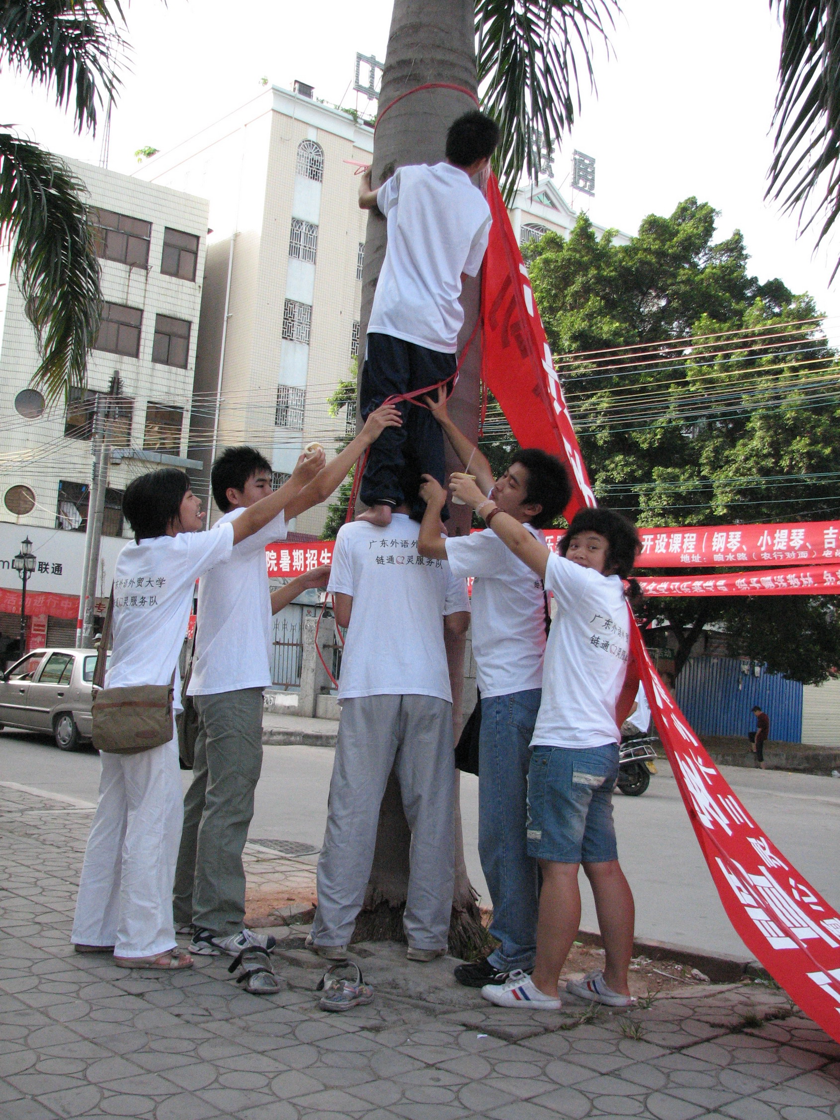 我看到,他们齐齐努力把横幅挂……