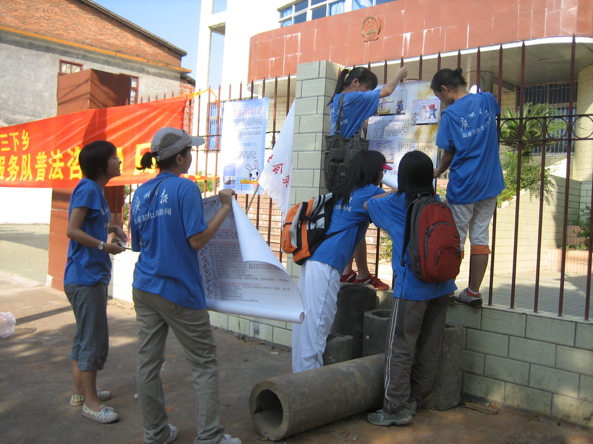 到达人民法院以后,现场布置工作有条不紊地进行着。队员们纷纷积极地贡献自己的力量:有的队员拉横幅,有的搬桌椅,有的贴海报。期间,由于横幅的长度与预想有偏差,横幅的位置还发生了三次较大的变动。