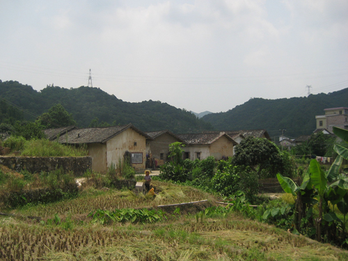 洛洞村位于比较边远的山区地带,抗战时是重要的革命根据地,并于93年被省政府授予革命老区的称号。我们怀着好奇和敬仰,浩浩荡荡地踏上了洛洞村访谈的坎坷征途。山路十八弯,公共汽车自然成为一种奢望.在万般无奈之下,我们只能搭乘当地所谓的“小四轮”(小型面包车)。小四轮摇摇晃晃爬坡而上,告别了平坦的水泥路后,等待着我们的是出乎想像的崎岖之路,而山路两旁却是深不见底的山沟.素来以巾帼不让须眉自诩的调研组女生们终于遇到“克星”,都吓到“魂飞魄散”。时间在颠簸中悄然远逝,眼前也豁然开朗起来了。广袤肥沃的谷地,风味独特的客家土屋,一切都那么似曾相识。正是稻收时节,处处是稻花香里说丰年,听取“笑声”一片。