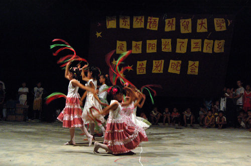 简陋的舞台周围,筑起了一面面的人墙,热闹非凡。两位主持人简短煽情的开场白,拉开了精彩表演的序幕。充满青春活力的舞蹈、优美的口琴、幽默及蕴意十足的小品、倾情的歌唱,博得现场一次又一次的掌声。将太极与舞蹈结合的《国风》,甚是受到欢迎。每个高难度动作的完美演绎,都会引起现场的阵阵喝彩声。小学生们也毫不逊色,彩带飞舞的舞蹈《欢乐中国年》与可爱活泼的舞蹈《不怕不怕》,同样让人耳目一新。现场观众看得津津有味,啧啧称赞。师生齐舞的舞蹈串烧,则散发着师生间浓厚的爱。