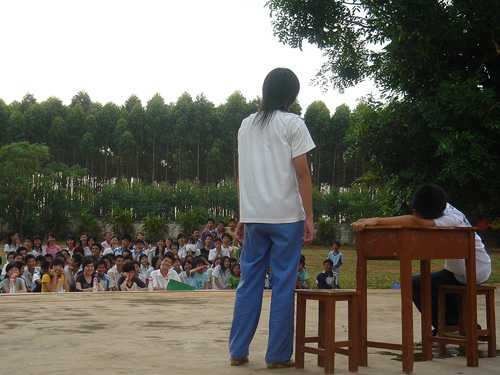 表演用的剧本都由英语组的老师根据学生的英语程度编写而成,同学们自愿报名参与。他们一般用午睡的时间来排演,走读生还主动要求留下排练:“老师,我们可以放学后一直排练到七点的。”经过三天紧张的彩排,英语老师悉心的指导和班主任鼎力的帮助让戏剧大赛得以如期举行。