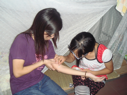 对于下乡,所有的队员都做好了吃苦的准备。简单的饭菜,简陋的住宿条件,都没有阻挡大家对下乡的热情。然而,让人痛苦的是,大部分队员的皮肤都出现了疼痒。几天时间下来,大家身上、手上、脚上甚至脸上都出现了红肿包子,这些包子不仅长相骇人,而且让人痛痒难受。队员们竭尽脑汁,皮炎平、清凉油、花露水,能用的都用上了,却收效甚微。