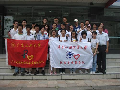 此次乳源东坪三下乡队伍得到了东坪镇镇政府和东坪中学校领导的大力支持和鼎力帮助。队伍由广东外语外贸大学国际经济与贸易学院金融(2)班组织,本校队员分为义教组和调研组两支小组,同时还有广州中医药大学的研究生组成的义诊组和广东工业大学的无线电社社员组成的义修组参与其中,一共25人。