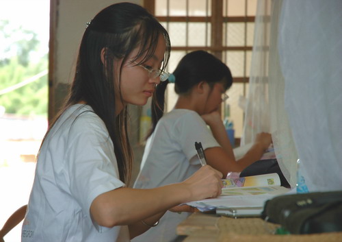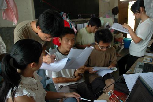 服务队中有一个小组同样不可忽略,他们很少驻留在服务基地,他们几乎走遍了庆丰村,他们在那条通往县城的泥泞道路上来来回回穿行了无数遍,他们就是“庆丰·梦想”服务队的调研组。调研组里七个人其中有三个女生,她们却从来没有把自己放在被保护的位置上,每一次的调研访问,都是她们走在最前面与被访者进行思想的交汇和碰撞。在这个小团队里,组长林超始终坚持着“尊重每一个成员的意见”的工作宗旨,每一次调研前都会反复讨论以确定最合适的调研问题,每一次调研回来总结也是必不可少的。由于调研组为了减少笔录造成的失误大部分是采用录音访谈,调研过程中大部分录音的文字资料整理都是由调研组里的小妹妹——范新紫独立完成的,那个坐在电脑前重复地听着录音作着笔记的小小身影,成为了调研组里面一道独特的风景。