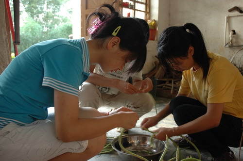“庆丰·梦想”服务队的24名队员大部分都是在城市里长大的,对于从小被捧在掌心上的队员来说,自己做饭洗衣成了他们来到基地第一个要克服的生活问题。每个负责煮饭的小组早上总是五点半就起床,面对十一天如一日的豆角、通心菜和猪肉,不同的小组都费尽心思的变着法子煮不同的菜式。在排练大合唱期间,值日的队员隔两三天就会尽量省下当天的费用给其他队员们煮糖水。