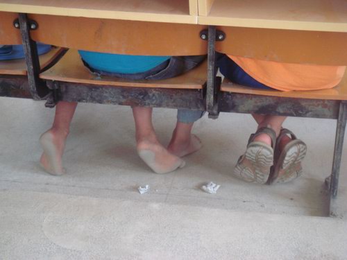 踏进杜步中学的那一刹,我发现了赤脚的孩子。他们就这样赤着脚踏在被艳阳灼烧的沙地上赶去考试。同时在他们的周围有许多穿着鞋的同学,有拖鞋、凉鞋、还有板鞋。
